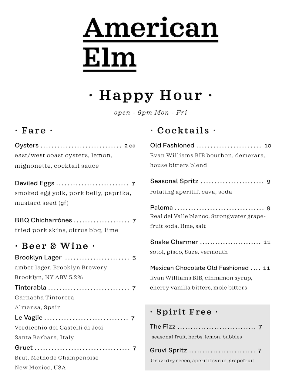 All of our spirits are served in half (1 oz), full (2 oz), or double (3 oz) pours.